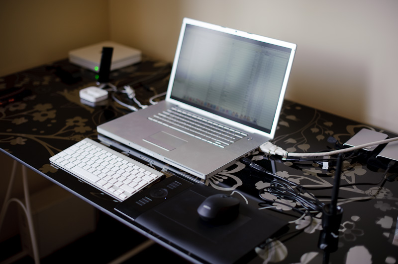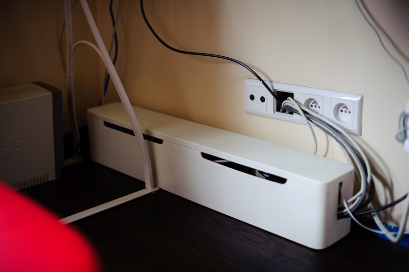 W każdym razie od jakiegoś czasu zastanawiałem się jak uporządkować kable pod blatem – ich estetyka pozostawiała wiele do życzenia. Jak widać na powyższym zdjęciu, ze ściany wydobywa się kłębowisko którego drugi koniec znajduje się pod telewizorem: