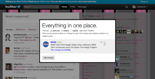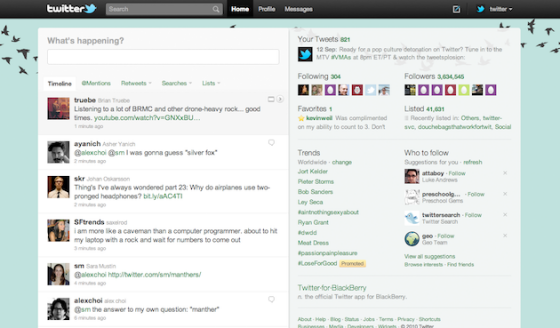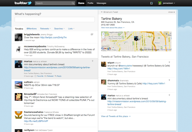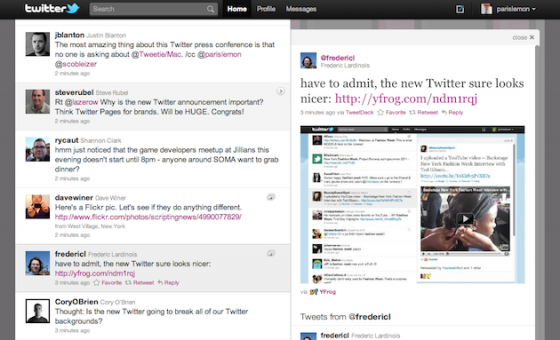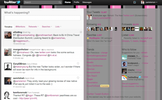 Dzisiaj odbyła się konferencja Twittera, promująca nowy design ich strony WWW — twitter.com. Layout nie tyle zmienił się, co został rozszerzony o nową funkcjonalność mocno przypominającą niedawno wypuszczonego klienta dla iPada. Najważniejszy element to wysuwany boczny panel na prawo od głównego streamu, pokazujący zawartość tweetów bez konieczności przechodzenia do podlinkowanych stron internetowych. Partnerami są teraz YouTube, DailyBooth, DeviantART, Etsy, Flickr, Justin.TV, Kickstarter, Plixi, TwitPic, TwitVid, Ustream, Vimeo, yFrog i kilka innych …
