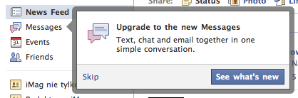Powinniście w prawym pasku, na głównej stronie Facebook.com, już mieć dostęp do nowych wiadomości. U mnie przed chwilą wyskoczyło … Dostajemy oczywiście email o strukturze username-jaki-wybraliśmy@facebook.com.