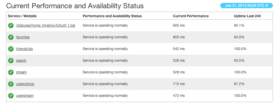 Ta informacja niewiele nam mówi niestety. Warto zatem zerknąć na stronę monitorującą status API Twittera. Tam znajdziemy szczegółowe informacje na temat tego co nie działa. Poniższy screenshot jest już „na zielono”, ale jak sprawdzałem wcześniej to większość pozycji świeciła ostrzegawczo na czerwono.
