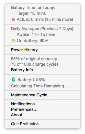Aplikację FruitJuice [Mac App Store link] używam już od ładnych kilku miesięcy. Korzystam z niej na swoim MacBooku Air 11.6″, a ona codziennie dyskretnie informuje mnie ile czasu powinien spędzić na kablu, a ile na baterii. Ciekawostką jest fakt, że na moim Airze działa zupełnie inaczej niż u Maćka Skrzypczaka na jego MacBooku Pro z Retiną – opisywał program w ostatnim wydaniu iMagazine.