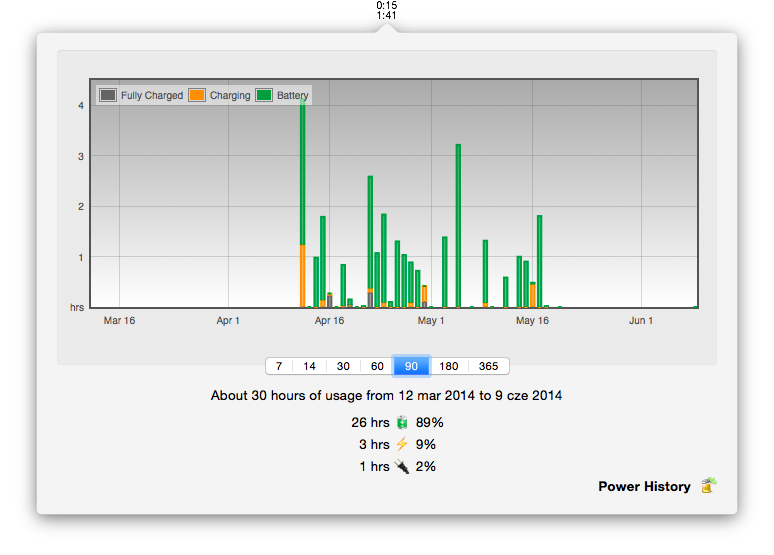 Program żyje w górnym pasku. Możemy zdefiniować w jego preferencjach co dokładnie ma wyświetlać na ikonce – u mnie jest to czas pracy na baterii oraz pozostały czas pracy do całkowitego rozładowania. Możemy też kliknąć tę ikonę, aby rozwinąć pasek, w którym znajdziemy bardziej szczegółowe informacje na temat naszego akumulatora, takie jak średni czas pracy na baterii z ostatnich 7 dni, obecną pojemność akumulatora oraz ilość cykli ładowania jaką przeszedł. Program dodatkowo wyświetla informacje o pozostałym czasie pracy oraz informację procentową. Możemy również wybrać z listy opcję Power History, która wyświetli nam wykres przedstawiający nasz sposób pracy – czas spędzony na baterii i pod ładowarką – dzień po dniu.
