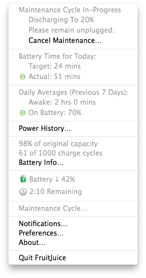 Nigdy specjalnie nie przejmowałem się akumulatorem w komputerach. Dbam o nie pod względem biernym – nie zostawiam komputera na słońcu, nie pozwalam się baterii przegrzewać i tym podobne. Jeśli chodzi o samą pracę to robię tak jak mi wygodniej – nie mam zamiaru być niewolnikiem elementu, którego można wymienić na nowego za kilkaset złotych. Pomimo tego, cieszy mnie fakt, że FruitJuice dyskretnie, za pomocą powiadomień informuje mnie o pewnych kwestiach. Program niestety nie jest tani, nie odmieni Wam życia, ale mogę go śmiało polecić każdemu posiadaczowi MacBooka.